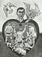 O crente que deixou a vida cristã. Um olho está se fechando e o outro no mundo. Já diminuiu a luz do evangelho e a estrela da consciência está quase apagada. A cruz transformou-se num peso e ainda vai à igreja, não por amor, mas sim para enganar-se como religioso. Está cercado de tentações. O espírito da vaidade (pavão) e imoralidade (bode) procuram entrar. Depois o vício (porco). Então fica nervoso e com raiva (onça). A mentira e inveja (serpente ), bem como o amor ao dinheiro (rã) procuram infiltrar. O demônio esfaqueando o coração, representa aqueles que com deboches ferem o coração do cristão. O anjo tenta mostrar o caminho certo.