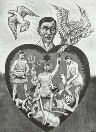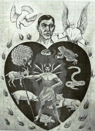 No coração pecador os animais representam: orgulho e vaidade (pavão), imoralidade e sensualidade (bode), bebedeira e glutonaria (porco), preguiça (tartaruga), raiva e mau humor (onça), mentira, inveja e malícia (serpente), avareza (rã). Por isso satanás ocupa o lugar central neste coração. O rosto está é triste e infeliz. A estrela da consciência está apagada e cega sem diferenciar o certo do errado. Mas o olho de Deus vê tudo em seu interior. Em torno do coração as chamas de fogo mostram o amor de Deus. O anjo procura uma oportunidade. A pomba do Espírito Santo, está fora do coração por causa do pecado, mas procura uma maneira de entrar e iluminar sua consciência.2º QUADRO: Coração convicto do pecado