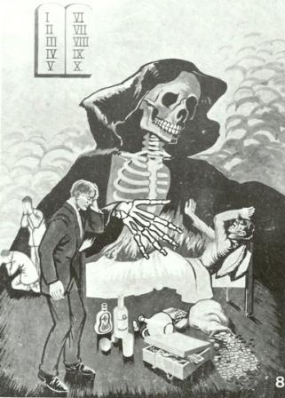 O pecador aproximando-se do fim, com o corpo cheio de dor e a alma com medo da morte (esqueleto) que veio numa hora inesperada. Os prazeres do mundo foram embora. Ao alto contempla a lei de Deus e ele tem de encarar, na sua realidade, o terrível salário do pecado (Rom 3.23). Embora ele agora deseje orar, encontra dificuldades para ter comunhão com Aquele cujo amor desprezou. Os velhos amigos têm medo de permanecer ao seu lado e as vãs palavras de conforto já não o ajudam. As suas riquezas, não podem prolongar a sua vida nem salvar a sua alma.
